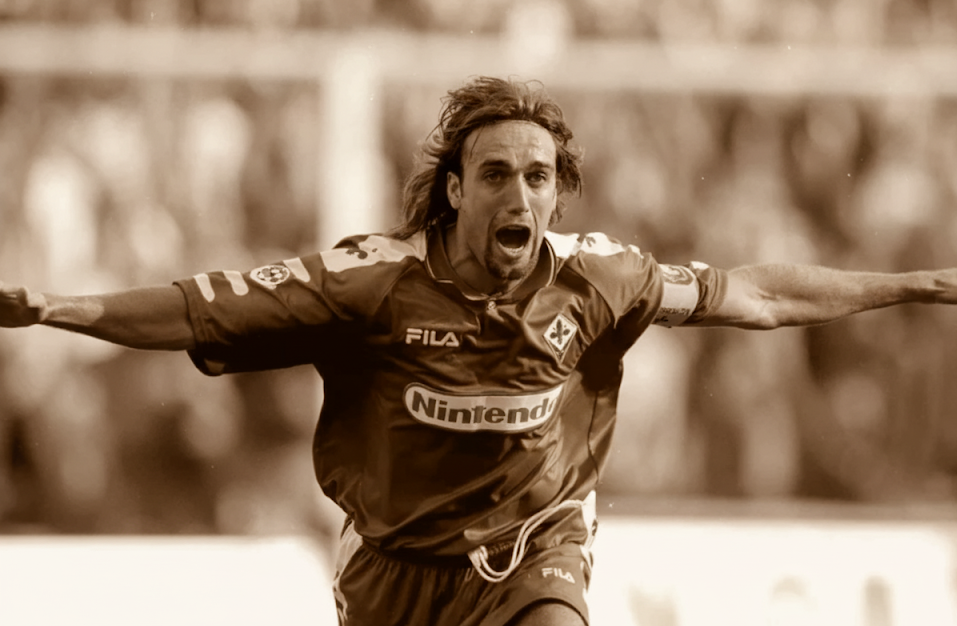 Igranje za Fiorentinu u njegovom srcu je zauvijek ostavilo poseban trag. U toj ljušturi prelijepe ljubičaste boje, postao je legenda. Postigao je preko 200 golova, a navijači su ga obožavali. Toliko su ga voljeli da su mu, nakon što ih je odveo do osvajanja Kupa Italije 1996. godine, podigli spomenik ispred stadiona. Nije to bio samo spomenik golovima, već spomenik ljubavi i lojalnosti.